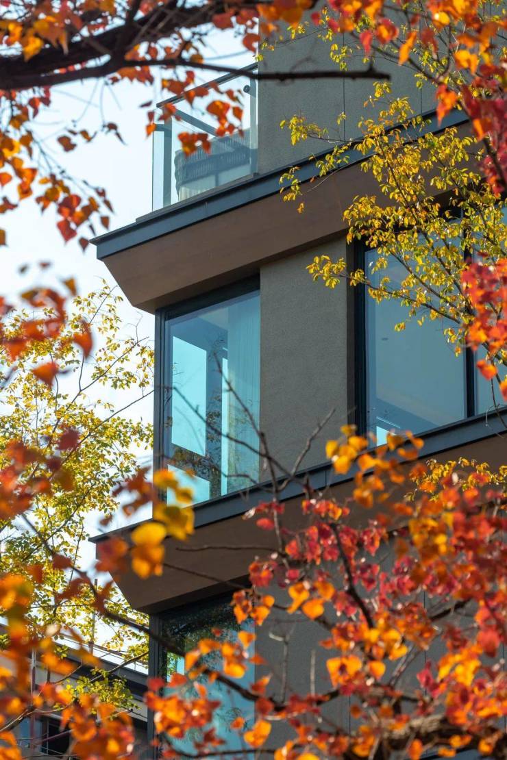 项目外立面采用大面积玻璃窗、深灰色金属框立面打造而成,温润优雅。