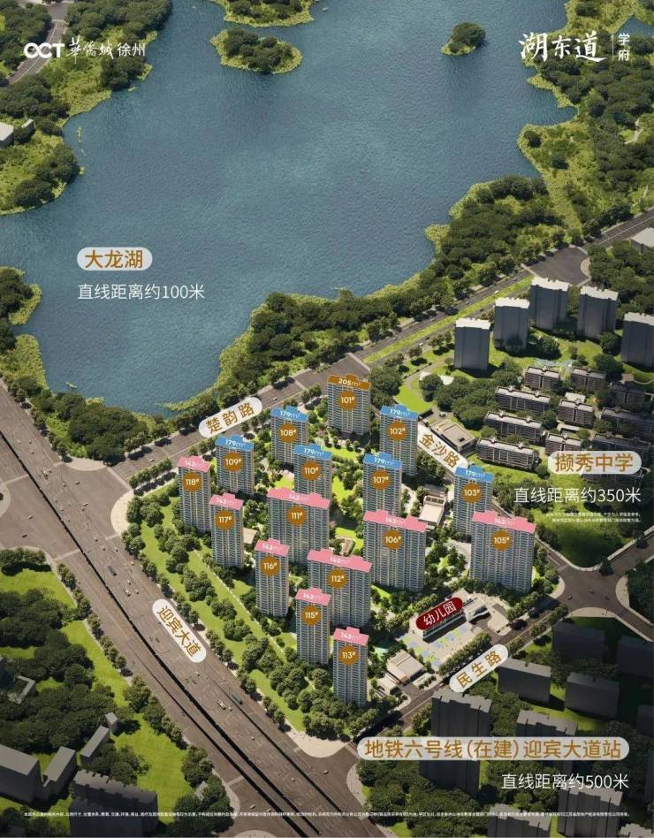 地理位置:项目位于徐州新城区金沙路与楚韵路交界处,雄踞城市核心地段,与大龙湖仅一路之隔,距离湖岸线最近处约 100 多米,是真正的一线观湖社区。