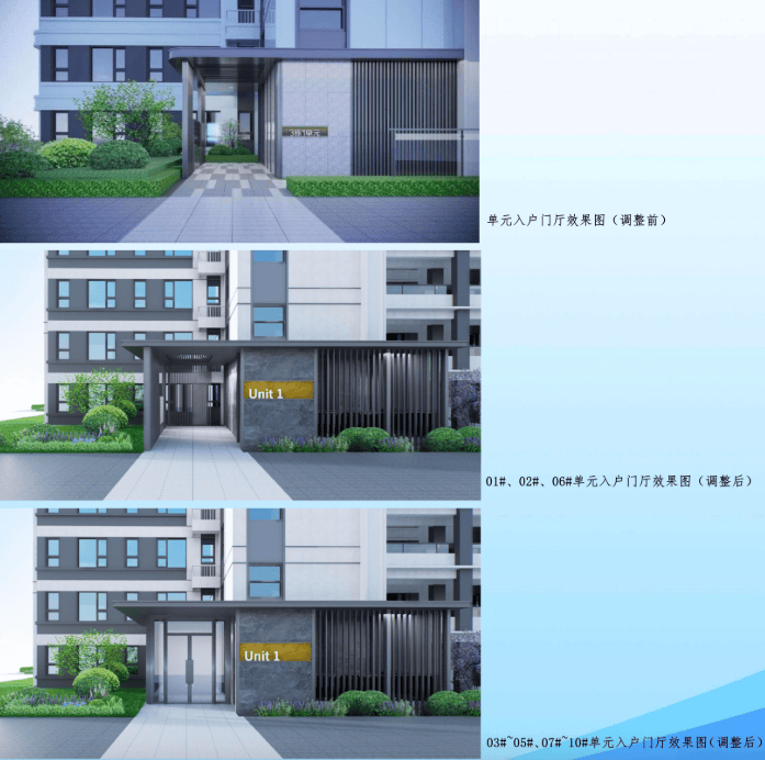 此外,入户大堂门厅等也做了调整,扩大了单元入户门厅,扩大了雨棚范围,调整隔栅样式。