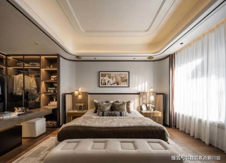 主卧套间呈现出时尚现代的风格,通透的玻璃衣柜与衣帽间展示着各种精致的服饰和配饰,仿佛置身于一个世界级时尚秀场,每一天的起床都是一场艺术之旅。