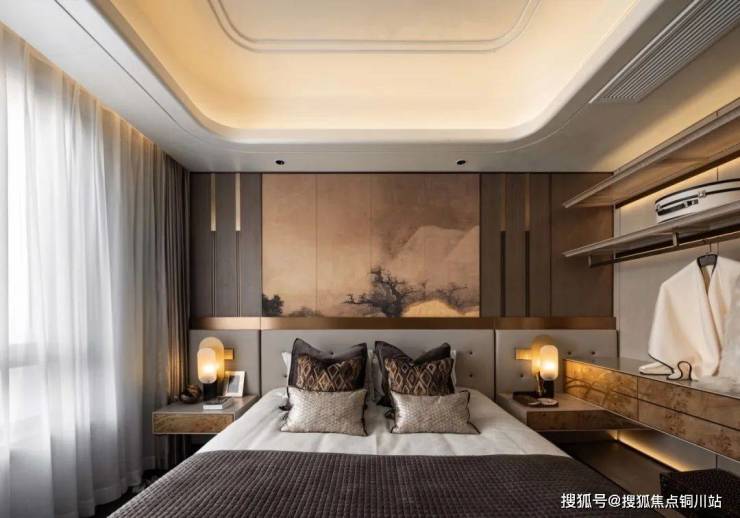 父母房散发着浓郁的东方古典气息,墙上挂着绘有山水的画作,它们真实而生动地展现着高耸入云的巍峨山峦,使人置身于恬静而古韵悠长的情境中。