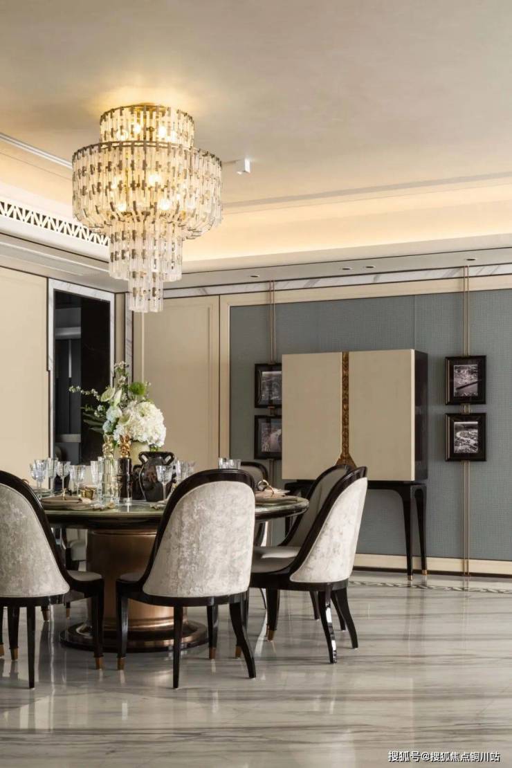 餐厅中央摆放着一张大理石圆桌,纹理如波浪一般精美流畅,给人一种宁静而又庄重的感觉。桌子上放着精致的餐具和刺绣餐巾,尽显主人的细致品味和追求完美的态度。而高高悬挂着的水晶吊灯犹如星辰闪耀,通过灯光的折射与反射,在空间中散发出柔和的光芒,让整个餐厅充满了浪漫与温暖。