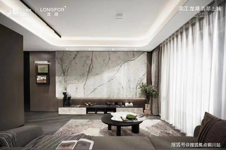 约6米面宽大横厅+约6米面宽瞰景大阳台,带来超大采光面。地面铺贴简一连纹仿石砖,相比于此前的瓷砖,做了升级。客厅背景墙是玉润金陵背景墙 ,相比此前的陶瓷大板背景墙也做了提升,品质感再上一个台阶。