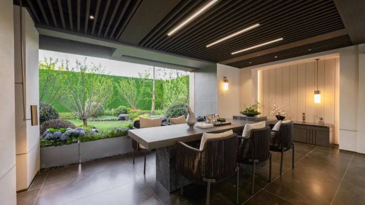 极具震感视觉和质感冲击背后,其实是更高的技术和造价成本。在立面处理上,横向延展的金属线条与大面积玻璃幕墙有机结合,呈现出独特光影镜幕立面;技术层面上采用三玻两腔节能门窗体系与一体板外墙,展现出项目独具一格的质感和格调。