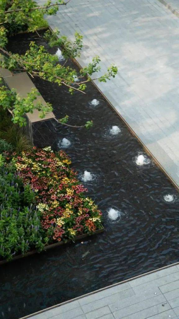步入社区,一眼便能看到层层叠瀑,融入绿韵醒目的景观笔触里,叠水、草坪、庭院、建筑与林下空间等元素组合到一起,层次分明,情景交融。