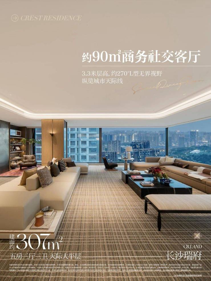 长沙瑞府打造层高3.3米建面约307㎡云端大平层,约90㎡的社交客厅搭配270°的环幕式全景窗,让城市霓虹成为脚下的画卷;