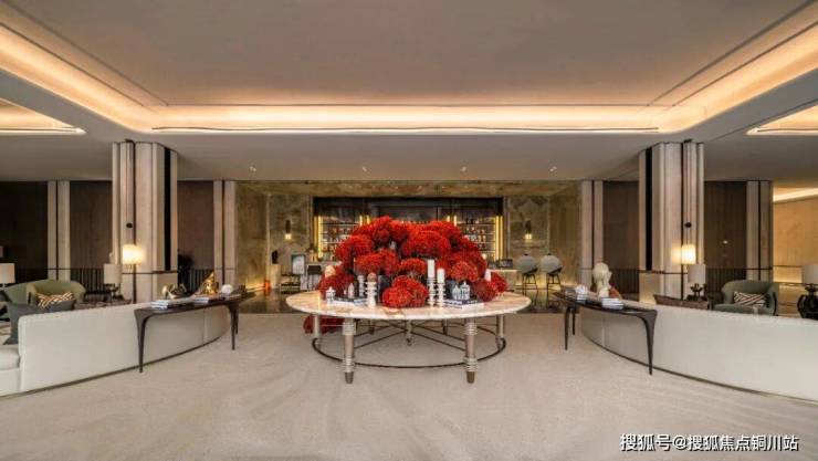 在建筑形体上,采用中心对称式构图来强调仪式感,两侧采用内凹环抱弧形墙面,酒店式环岛落客区、中央艺术水景以及顶部“万字曲水纹”图案的金属吊顶,随着灯光的虚实变化、明暗过渡将整体门厅衬托的高级又沉稳。