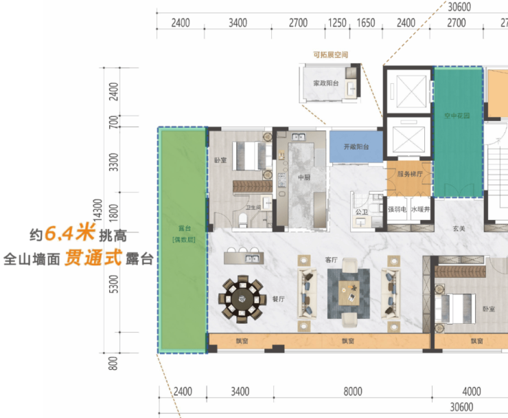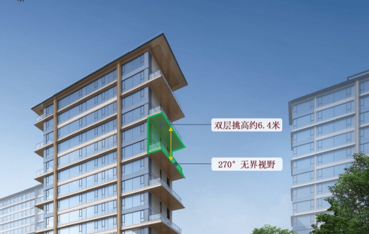 「全景舱」厅搭配约6.4米挑高、面积约17㎡空中错层露台,实现270°采光观景的互动社交空间。
