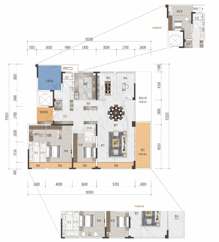 创新性地将大平层、别墅和四代宅的优点融合,实现大平层+空中墅居体验:
