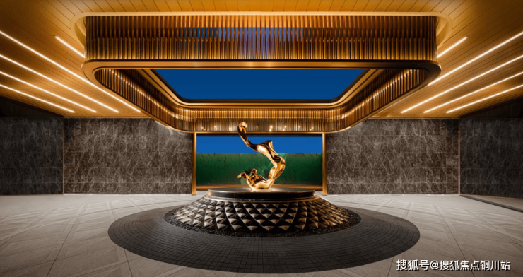 在社区大门打造上,越秀更是豪掷千金。前有“超宽领域归家大门“——58米宽、6.4米高的会所南大门惊艳市场,顶级爱马仕灰色大理石搭配香槟色金属,景墙立柱圆弧收边,立于两侧黑金沙花岗岩水景之上,尽显雅致气韵。后有70米宽、7.2米高的社区东大门再度超越。东大门景墙采用意大利灰石材、大花绿奢石与复古香槟金金属线条衔接,门庭采用香槟金外弧穹顶设计,融合龙鳞纹雕琢的中心环岛水景与现代雕塑的相得益彰,既形成强烈的视觉昭示性,又通过光影交叠的立体景观序列,实现从城市界面到私密社区的渐进式过渡。