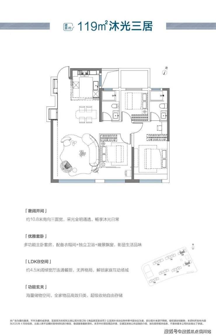 其中,建面约119㎡沐光三居,创新S型收纳墙,约10.8m南向三面宽+约7.5m联通式阳台,最大化室内日常采光,以约4.5m宽厅为核心,打造LDKB一体化布局,尽享家庭的欢聚日常。