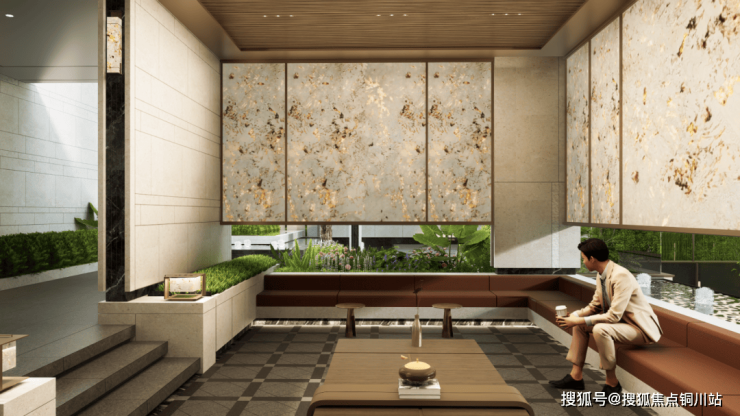 会所中央为约300㎡下沉庭院,灵感取自金陵胜景图“择水而居”,以蜿蜒递进的空间营造江南水乡意境。