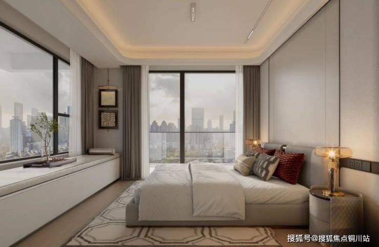 主卧开间约3.3米,带有超大飘窗台;主卧艺术背景墙更是运用了BV奢侈品元素的编制皮革纹,不仅触感柔软,还具有良好的耐用性,营造温馨而高雅的氛围。