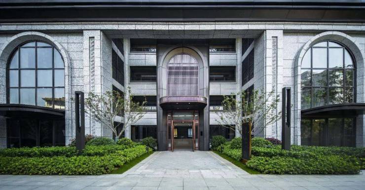 从大气恢弘的社区大门开始,便可窥见项目出类拔萃的高级质感;项目立面以浅灰色和深褐色为主色调,协调石材、铝板、真石漆、玻璃等材质,辅以飞檐、望板、立柱等建筑元素,以超越时光的新中式建筑审美,营造出典雅、挺拔、通透的感官视觉。