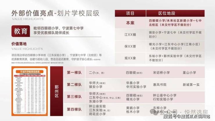 一方面链接三江口核心顶级城市核心资源,形成大城市片区单元,商业、休闲、工作、人居、娱乐、医疗、教育形成未来生活圈。沿百丈路形成1KM的黄金城市秀带(K11、新世界、波特曼大厦、宁波大学附属人民医院)。且教育配套是本案的价值优势,不仅拥有丰富完善的教育资源(配建15班幼儿园、四眼碶小学),以及江东第一梯队中学七中(学区以交付为准),且即将引进优质国际教育资源,并与学校签约。
