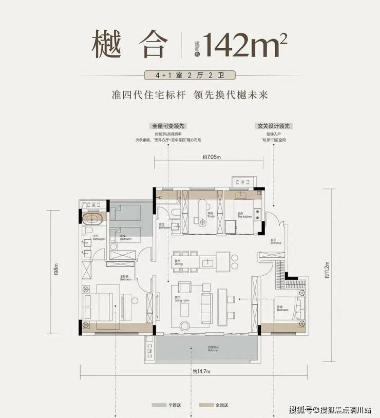 樾和户型建面约142平4+1室两厅两卫:前面有分析,南北通透,6个飘窗,2个阳台,优化面积非常多,约14.7米的南向开间,通透性和舒适度都非常高。