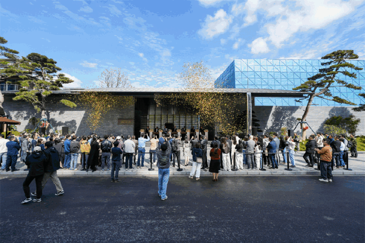 长约60米恢弘中式门头,冠以昆山首创铝镁锰三面顶,搭配整面石材墙面,极强的视觉冲击力气场全开。