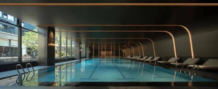 深邃的池水如镜,倒映着雅致的景致,墙顶一体的哑光铝板装饰墙为这片宁静的空间增添了几分私密与尊贵。在柔和的灯光与交织下,感受水流的轻抚,远离尘嚣。