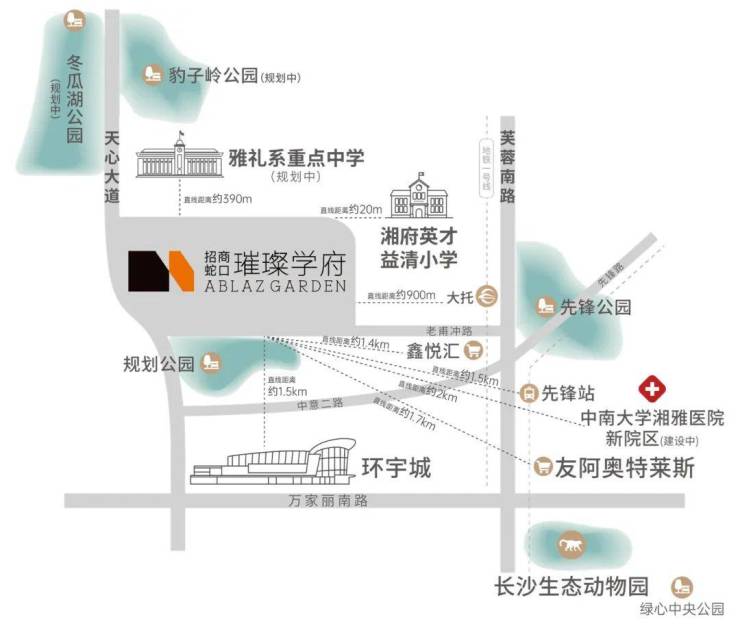 直线距离约1.1公里内邻长郡湘府中学,书声琅琅,滋育菁英成长。