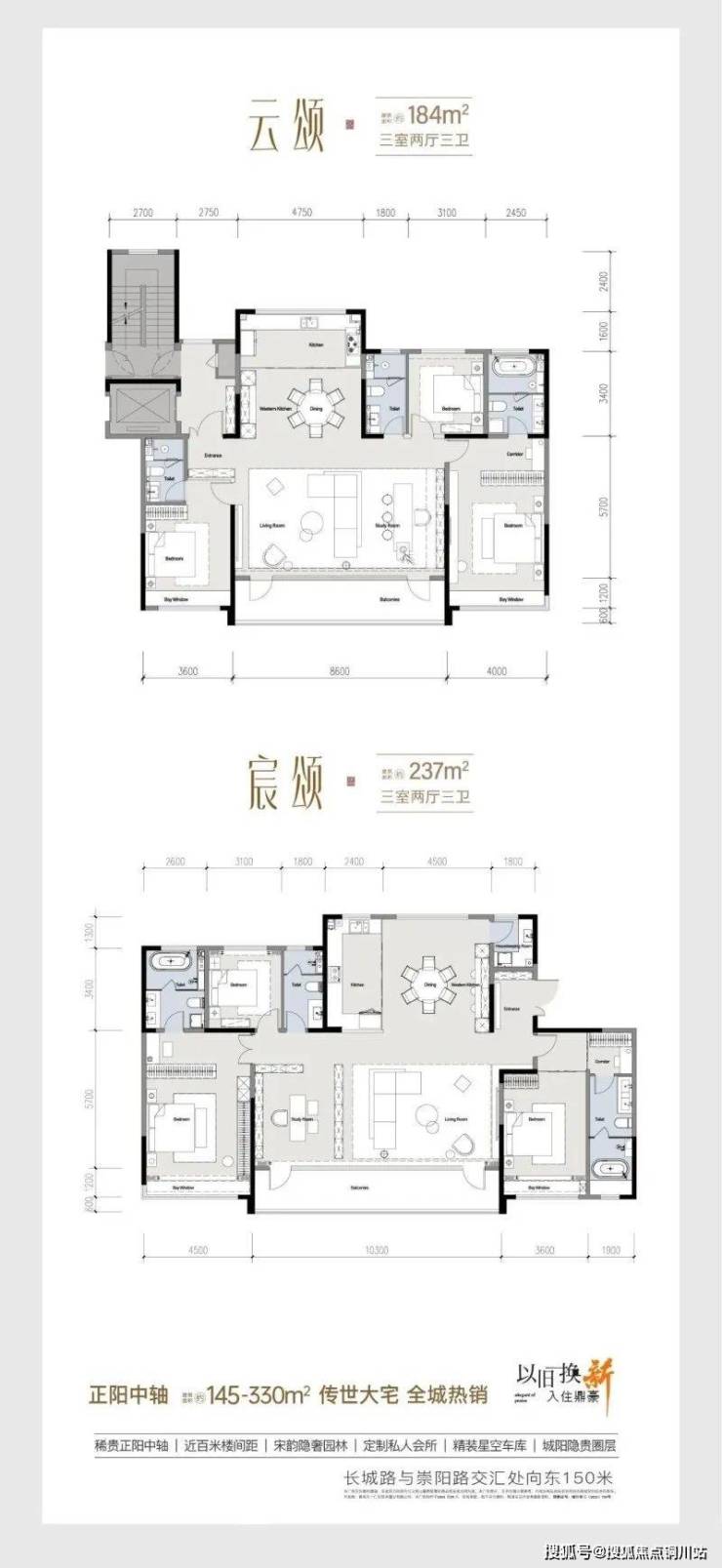 大户型改善定位:主推145-330㎡大平层,户型方正通透,动静分离,南向面宽最大达16.2米,主次卧双套房设计,私密性强。