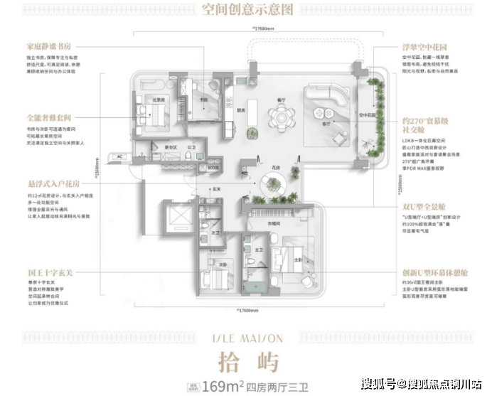 同时引入了悬浮式皇后花园,将U型端厅与U型端房串联,空间由此划分为了“社交舱”与“休憩舱”