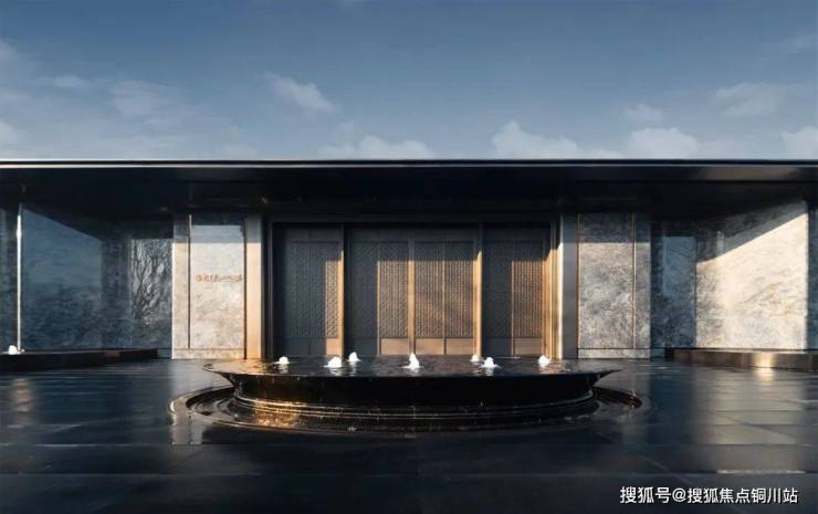 中间4扇纯铜锻造的大门长约60米,雕刻着故宫门窗传统纹样双交四椀菱花,同时大面积深色石材模仿了长江独特的岩壁地貌,传颂着长江的气韵,也彰显出归家的尊贵之感。