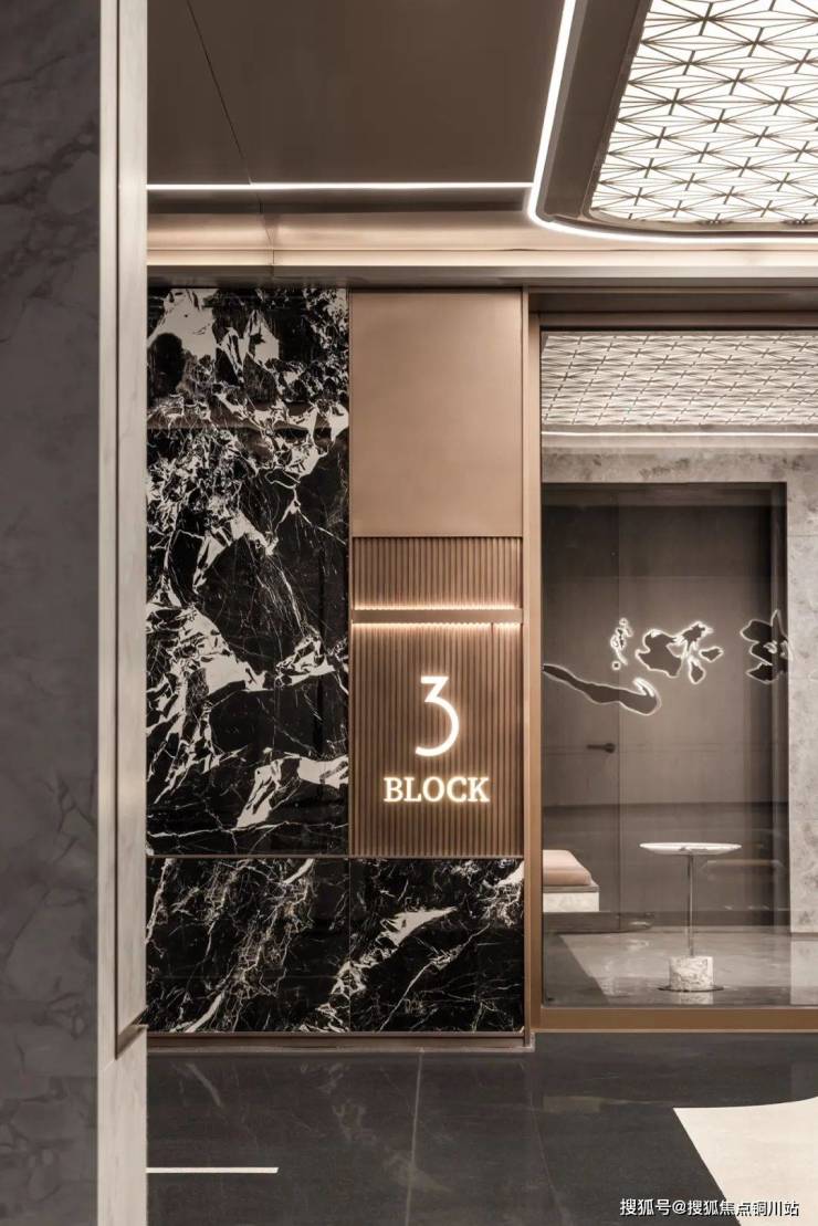 柱面由鱼肚灰的岩板镶嵌了精致的咖色不锈钢,大堂门口大延展面的拿破仑黑和米黄岩板,入户大厅地面采用无机磨石,镶嵌实心铜雕的长江之歌案名,溢出尊贵身份感。
