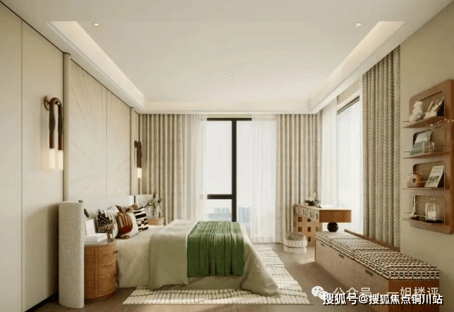 这个户型也是标准的四房,主卧做了270°拐角飘窗,功能性和舒适度均还不错。