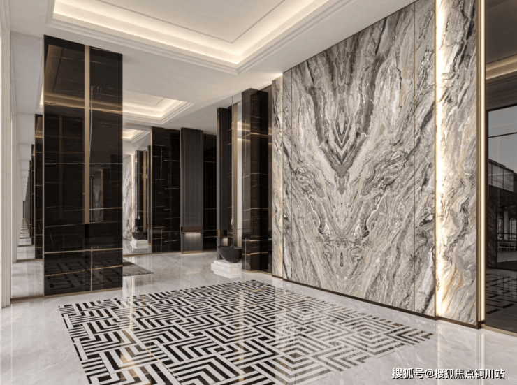 约5.5米层高的入户大堂,复制米兰宝格丽酒店室内风格,目之所及皆是名贵的石材。