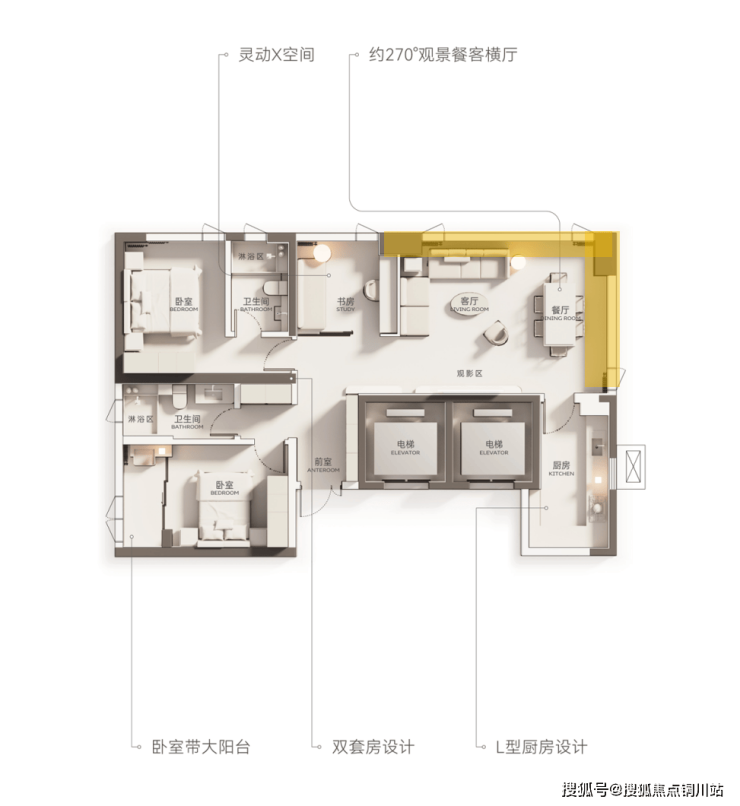 餐客横厅将城市夜景揽入家中,270° 环幕观景让沙发变身专属观景台,双套房给彼此和朋友留足空间,L型厨房做精致餐点,灵动X空间留给家里的毛孩子。这从不是一间简单的房子,而是为二人世界量身打造的度假式日常。