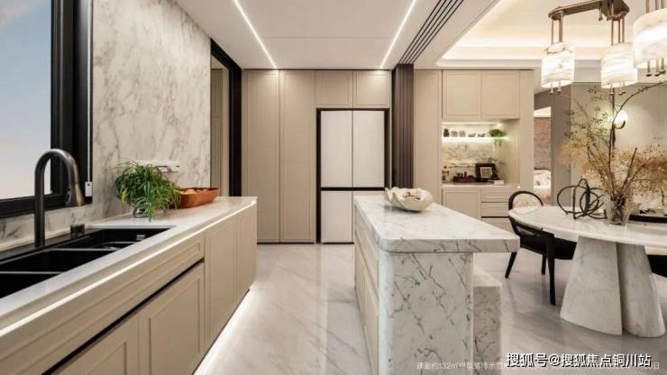 ● 客餐厅一体形成约39㎡社交巨厅,独立餐厅可以放得下6人大圆桌,开阔餐厨空间可设岛台;