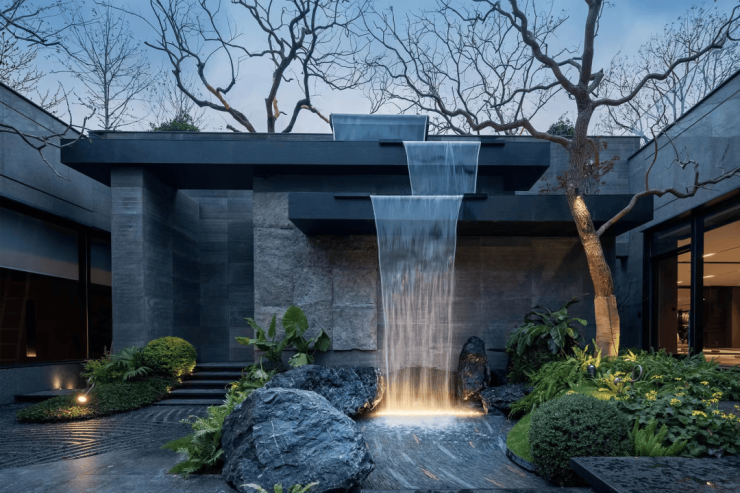 入门是三层叠瀑式景观,飞瀑直下流水万千;合光庭院、艺术长廊,在约1000㎡的镜面水景映照之下,浮光掠影,极富艺术格调。