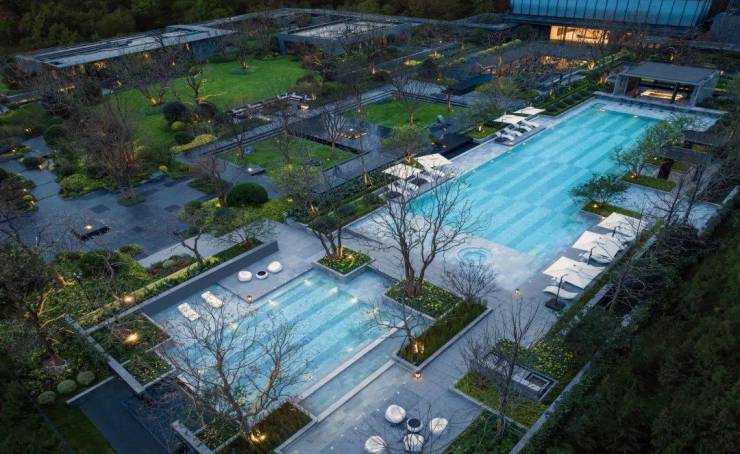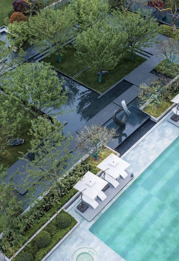 中央聚场结合美国建筑大师路易斯康落日广场的设计语言,四水归堂,水流静邃,8棵榉树矩阵,以中西式结合的设计手法,既显大气,更显格调。