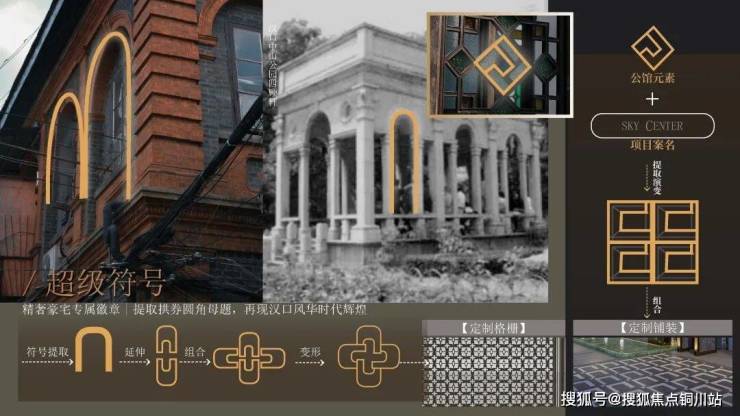 在铺装纹样设计上,景观从经典公馆的花窗中汲取灵感,以及线条、体块的巧妙组合,让古朴元素焕发出现代构成的冲击力与美感。格栅的设计则提取自骑楼建筑拱券的圆角母题,衍生定制金属格栅,形成了独特的项目身份标识。