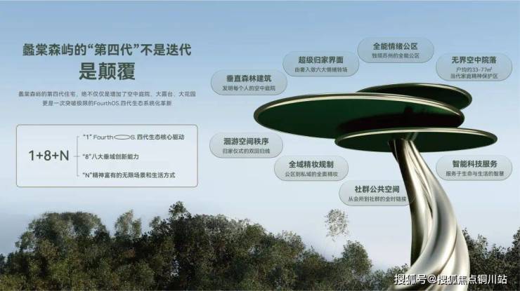 “1”代表着FourthOS.四代生态核心驱动;“8”是涵盖八大核心模块的垂域创新能力:垂直森林建筑、超级归家界面、高定情绪场域、无界空中院落、洄游空间秩序、全域精妆规制、智能科技服务,以及社群公共空间;“N”则意味着精神富有的无限场景和生活方式。
