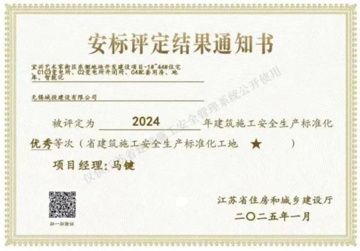 由无锡城建发展集团无锡安居开发、朗诗代建的安居·溪山院凭借严格的施工管理、智慧化技术应用及绿色建造理念,获评2024年江苏省建筑施工安全生产标准化优秀等次,荣膺省建筑施工安全生产标准化一星工地荣誉。