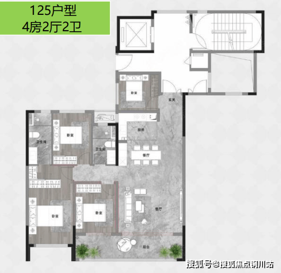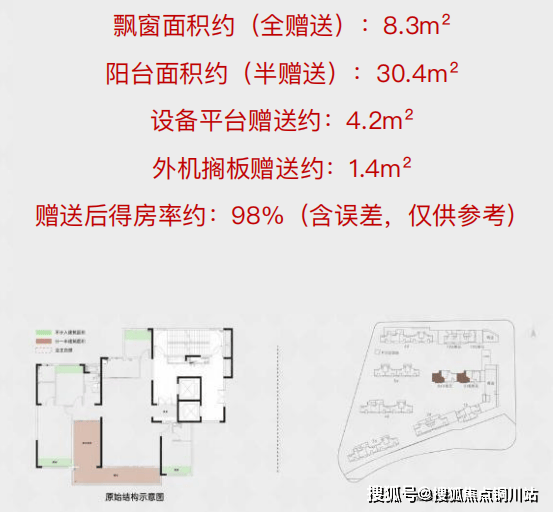 4房2卫格局,客厅面宽4.5米,阳台面宽7.3米,客厅可与南向次卧打通;形成超长的南向采光面。全赠送的全屋飘窗+ 半赠送的生活阳台和设备平台,实用面积约117m²,初步算得房率约96.8%。