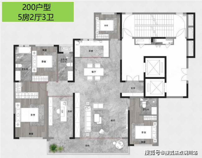 5房3卫格局,2T2户,电梯私梯入户,南向四面宽,阳台面宽7.6米,采光面大,主卧有独立的衣帽间,实用面积约153m²,得房率约104.3%,但玄关处有点浪费。