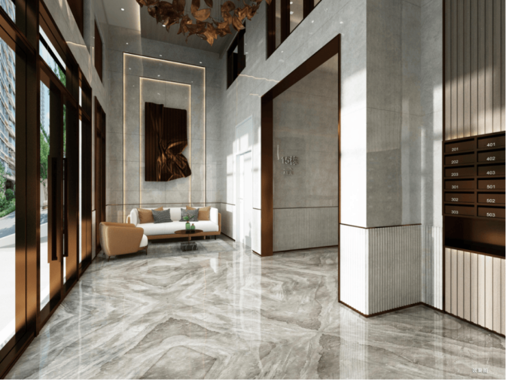 星级酒店标准精装入户大堂,从细节处精心雕琢,约6米极致挑高设计,打造明亮通透、视野敞阔的入户空间,以高规格让品质生活“奢侈”有度。