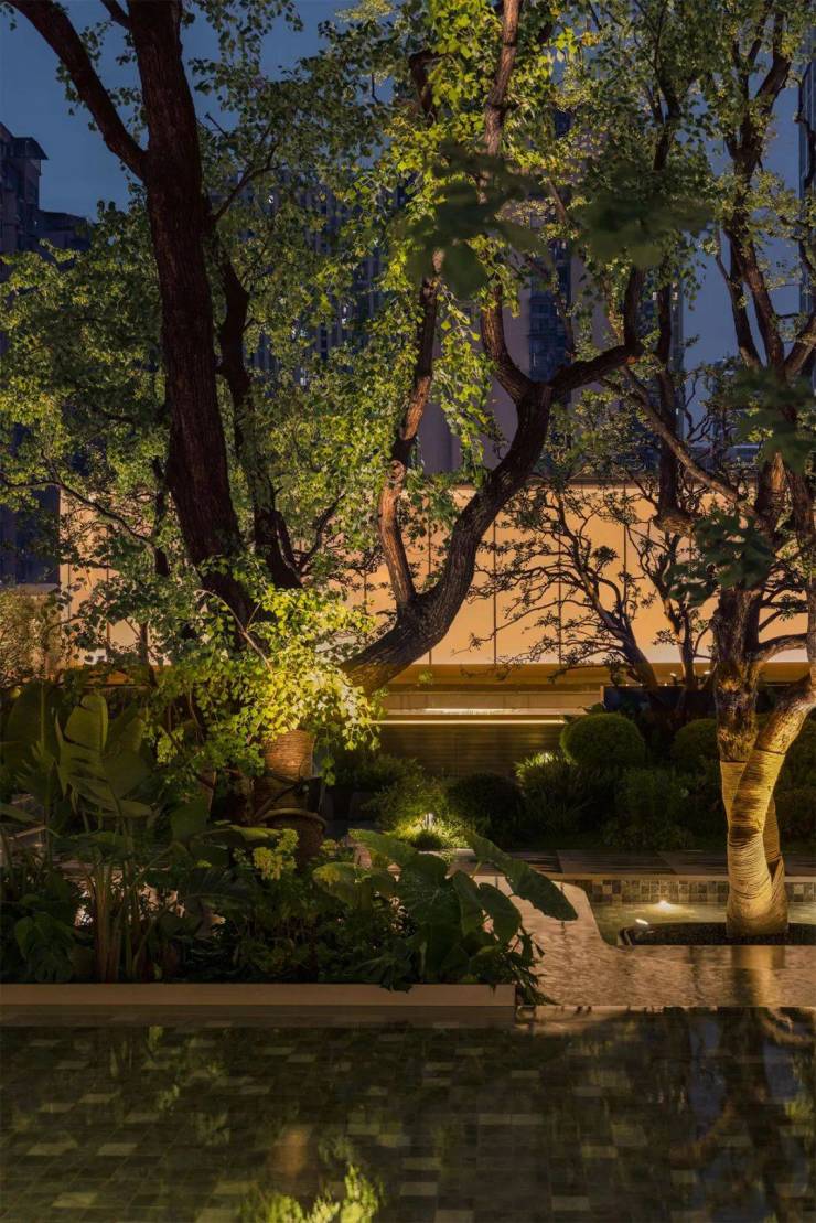景观与建筑的灯光在色温上达成了一致,都是3000K的温暖色调,共同营造出一个温馨舒适的环境。我们选择了点状光源的方式来勾勒出景观中的道路和植物等元素,避免了过多地使用线性光。这些柔和的星点不仅具有指引作用,而且不会破坏整个景观的整体形态,就像无数家的灯火一样,从商业区延伸到内院,增强了客户回家时的仪式感。