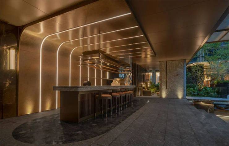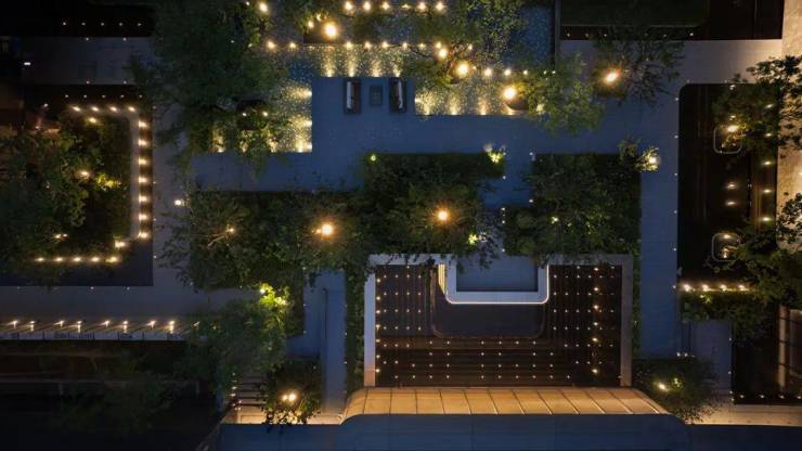 内庭半开放的金属元素,巧妙地映照出直线条的灯光,两者相得益彰,不仅为空间增添一抹装饰韵味,还巧妙地强调了空间的核心,与周遭环境构建了一种层次分明的视觉关系。
