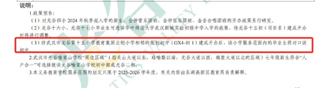 今年的官方划片文件中对光谷十五小教育集团云创小学对口的初中也做了预告。