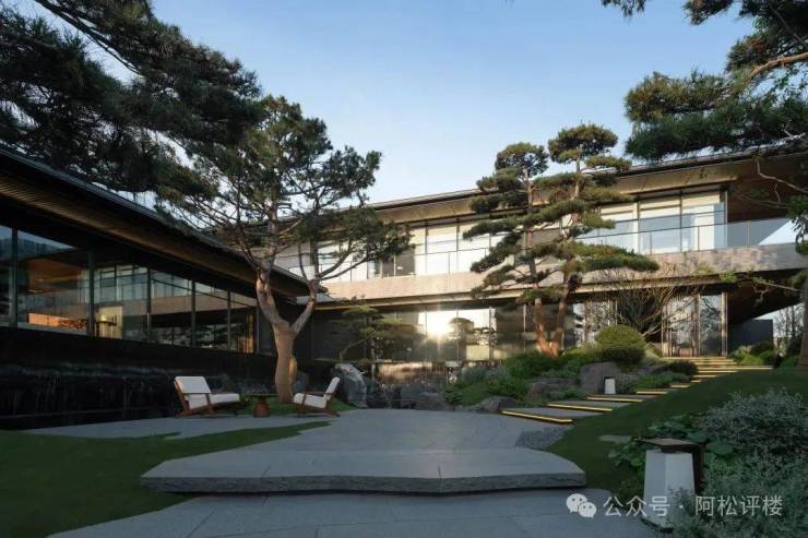 再往里走,所见即是招商天青府高大上的社区会所。传统坡屋顶与现代中空超白玻璃结合,双层叠水泉鸣瀑响,舒缓清幽,过滤喧嚣。