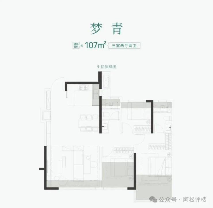 建面约107㎡三房,相当于三代住宅建面约120㎡以上户型,三房配置绰绰有余。是光谷在售入门级的四代小户型,相对较低的入手门槛,深受光谷年轻首置家庭追捧。