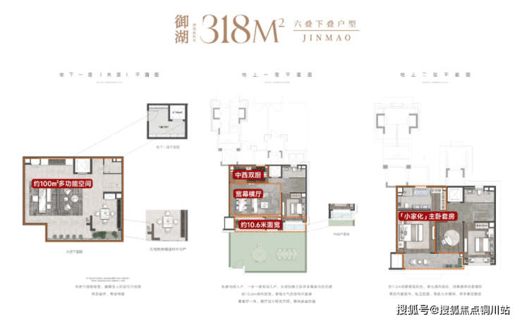以建面约318㎡下叠为例,最大化将空间利用到极致。下叠首层面宽约10.6米,不仅面宽达到这个级别少有的双层三面宽,还带来叠墅罕见的宽幕横厅,搭配院景,让风与光,来的如此汹涌。