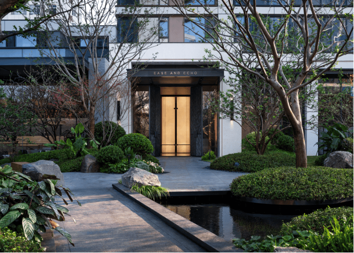 围合式景观布局:住宅采用围合式布局,实现景观最大化,形成超尺度中心花园。15 米生态退距将城市干道自然分离,两个地块均实现人车分流,小区打造酒店风格入园门口,内部拥有连续且安静的纯人行空间,楼栋之间有风雨连廊链接,地上地下两条归家动线,并打造了高品质的地上地下双大堂,为居民带来了尊贵的归家体验。