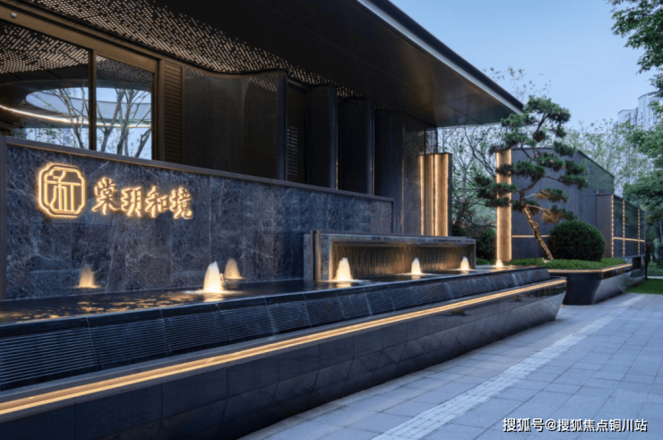 大门用料上采用石材和香槟色铝板,顶部辅以浪漫星空顶,加上入口迎客松,既为业主筑起了日常归家的礼序感,也将棠玥和境项目的高格调稳稳立住。