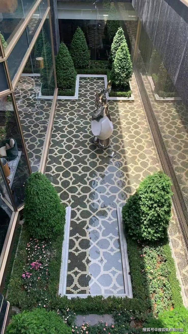 同样匠心雕琢的还有下沉式庭院池底的海棠拼花,自图纸精研至池底找平,经弹线定位、现场排布、嵌缝勾描,最终方得以呈现。