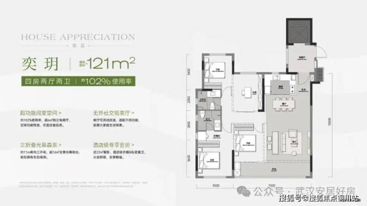 建面约121㎡四房两卫两卫,优化后约102%得房率: