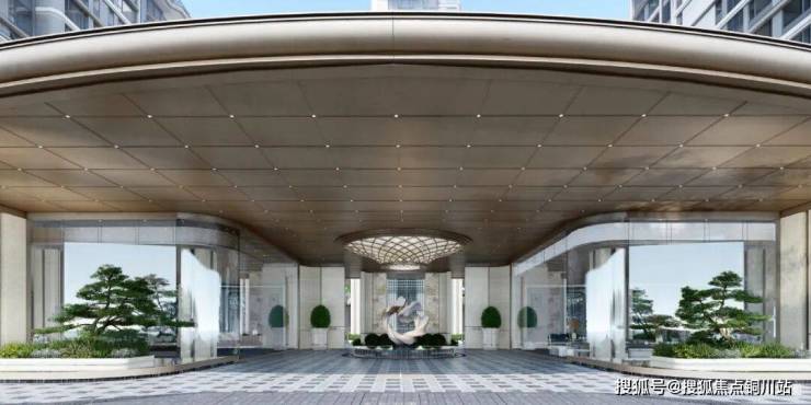 从具有昭示性的超尺度主入口与酒店式落客区开始,便确立了高端基调:主入口景墙采用贝金米黄天然大理石和潘多拉奢石,约80米宽,社区主入口两侧栽种两株全冠移植的臻贵黑松和叠水造景,搭配劳斯莱斯同款星空顶。